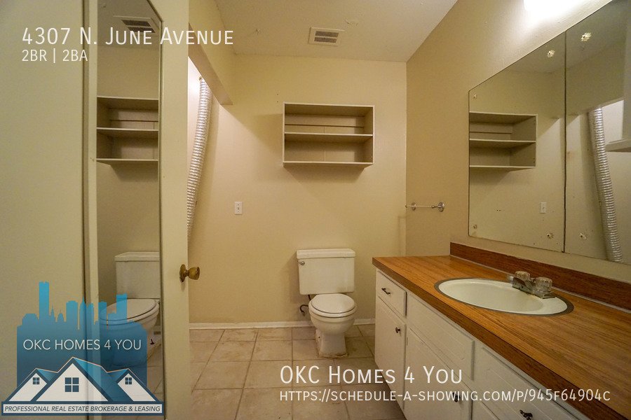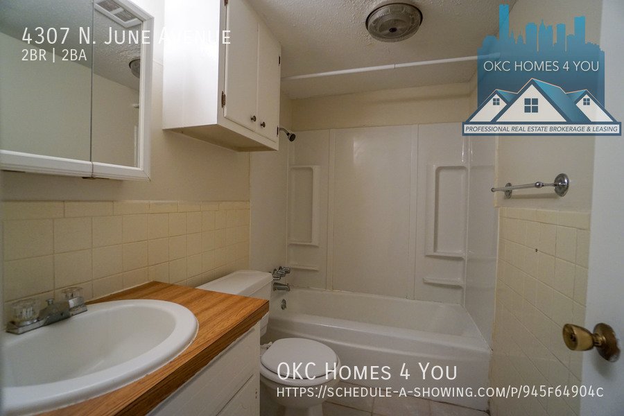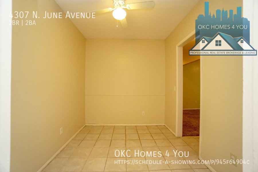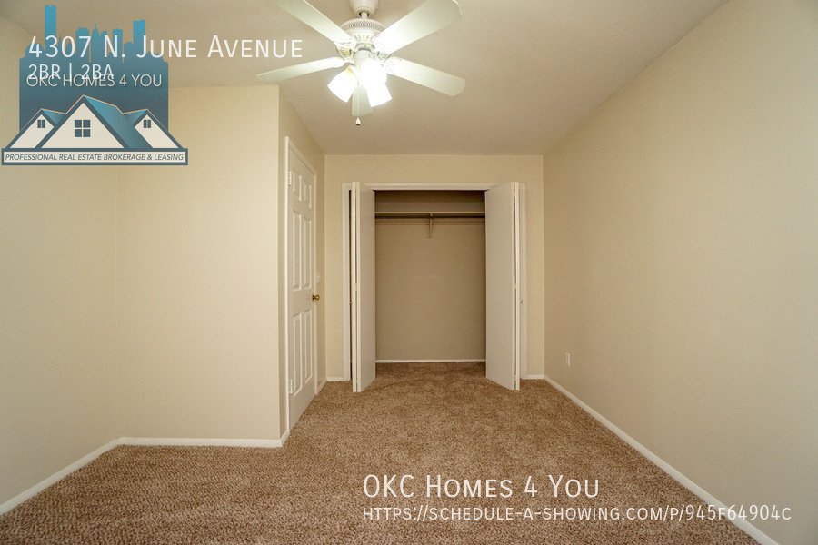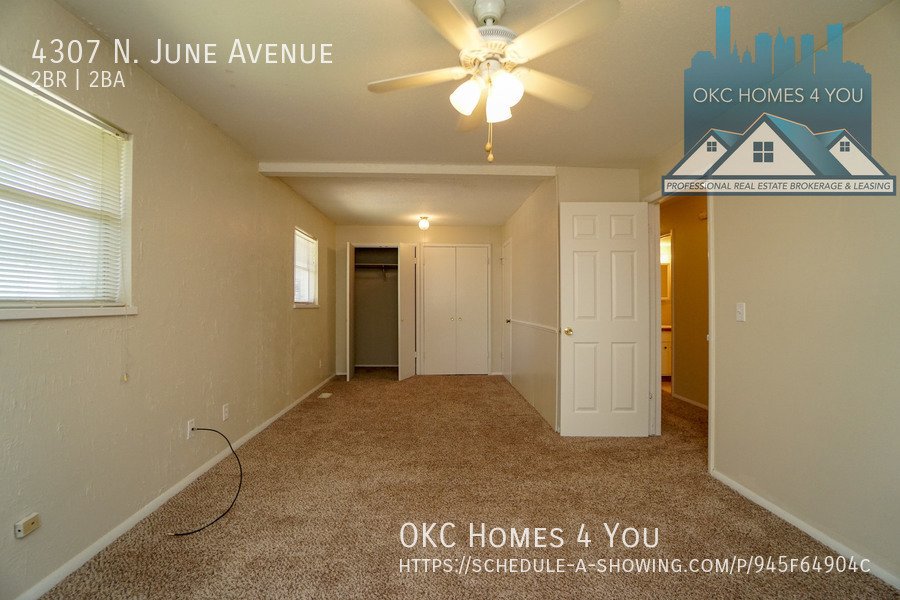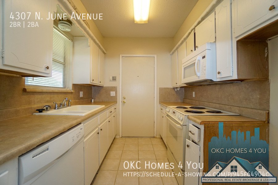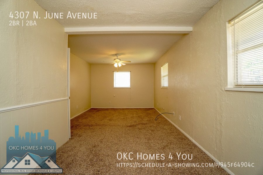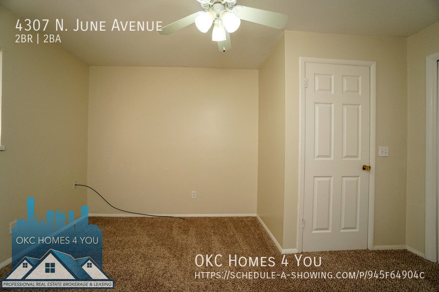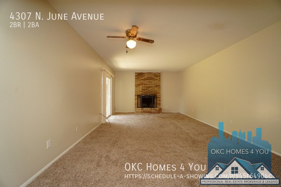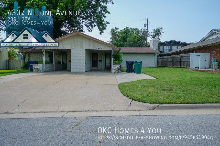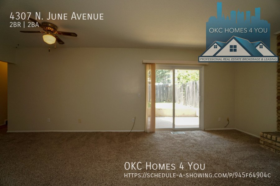 Just East of Portland Avenue off NW 42nd St. Go one block east, go North on June and the property is on your left. This 2 bed 1 1/2 bath duplex is in a great location offering quick access to I-44. The spacious living room has a brick fireplace and recently updated insulated sliding patio doors. The kitchen comes equipped with an electric range, built-in microwave, and dishwasher. Washer and dryer hookups are in the large half bathroom. The property has a fenced backyard and a carport with large storage closets for tenant use.