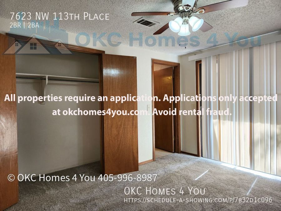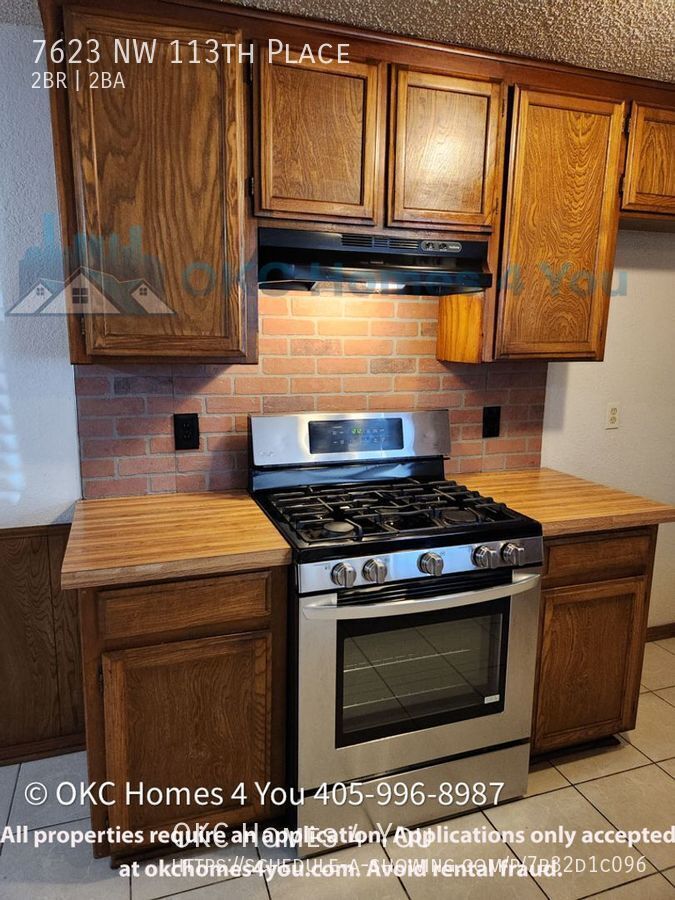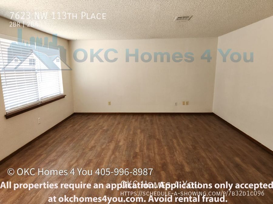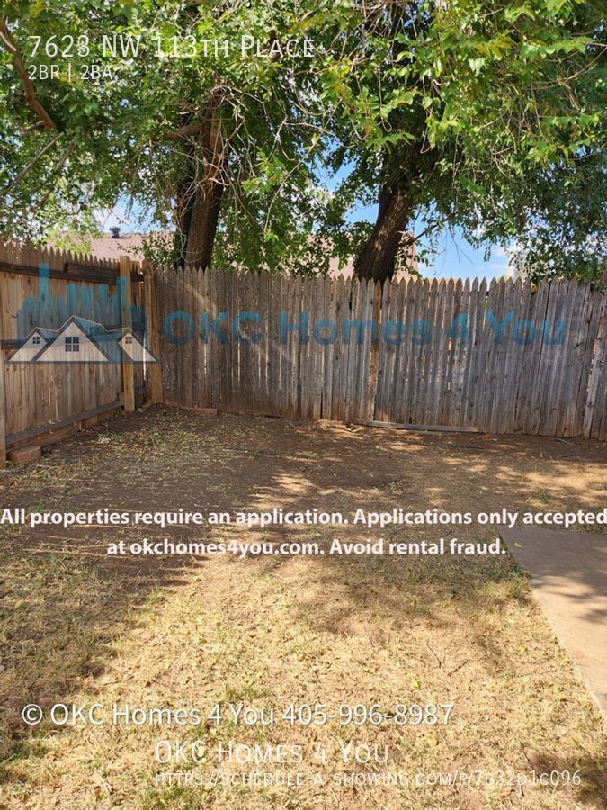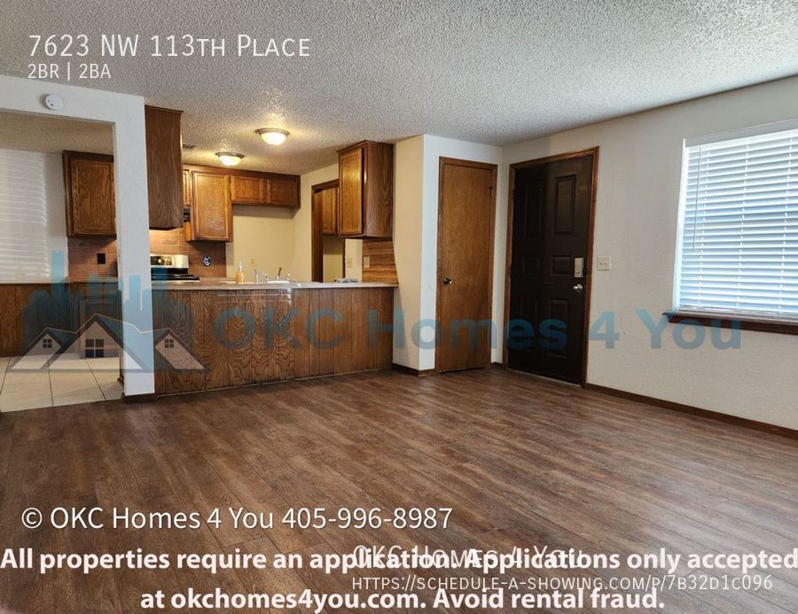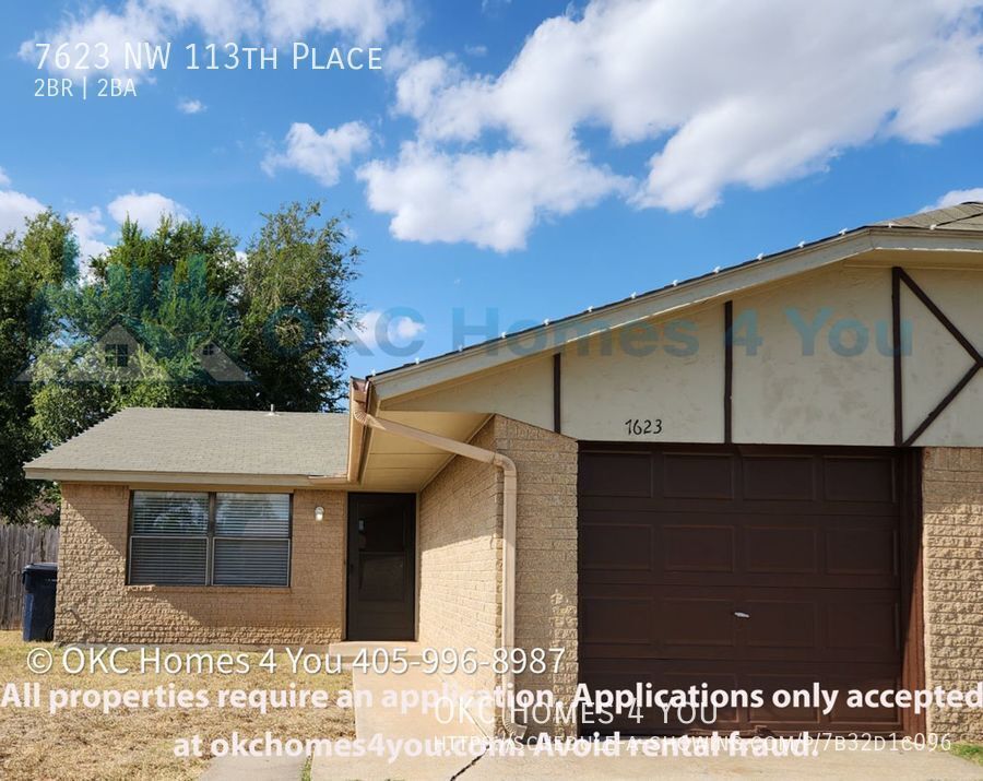 This 2 bed 2 bath duplex is located just east of Council Rd off NW 113th St. There is a coat closet as soon as you enter. There is wood look vinyl plank flooring in the living room. The living room is open to the kitchen and dining areas which have ceramic tile floors. A stainless steel sink, dishwasher, and stainless steel 5-burner gas stove are featured in the kitchen. Both bedrooms have carpet, ceiling fans and access to the back patio. There are gorgeous granite tops with under mount sink and nickel fixtures in each bathroom. The home also boasts updated nickel light fixtures throughout the home. Washer and dryer hookups are in the utility room off the kitchen. There is a 1 car garage with opener and 2 car width driveway for parking.