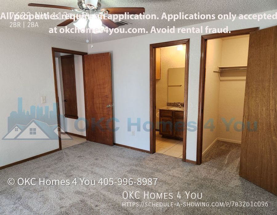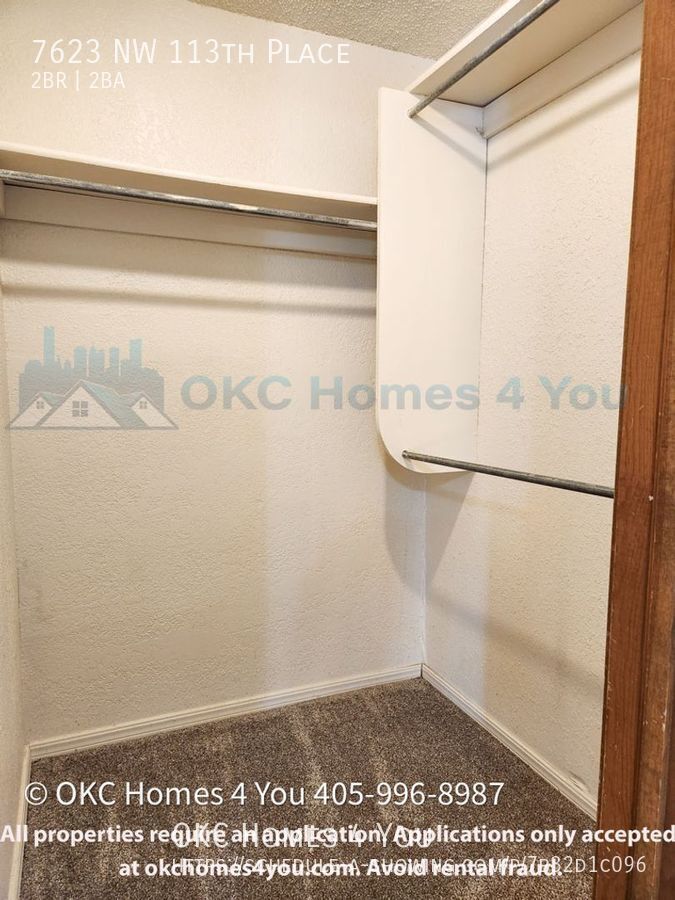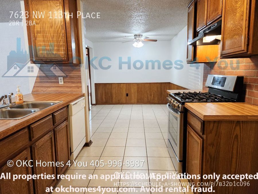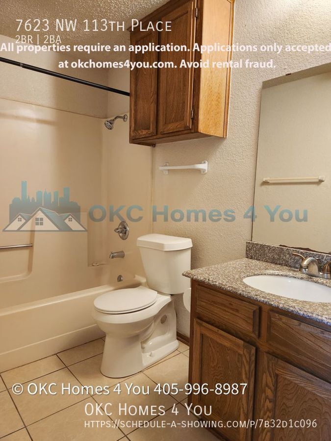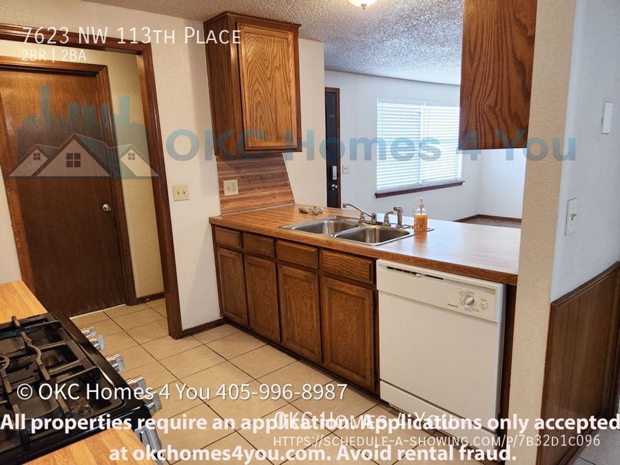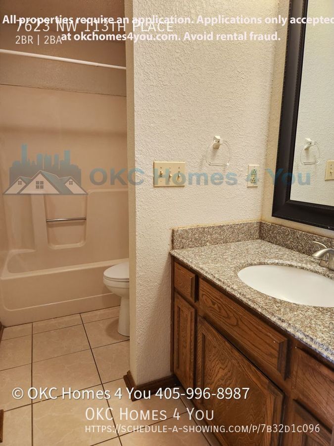 This 2 bed 2 bath duplex is located just east of Council Rd off NW 113th St. There is a coat closet as soon as you enter. There is wood look vinyl plank flooring in the living room. The living room is open to the kitchen and dining areas which have ceramic tile floors. A stainless steel sink, dishwasher, and stainless steel 5-burner gas stove are featured in the kitchen. Both bedrooms have carpet, ceiling fans and access to the back patio. There are gorgeous granite tops with under mount sink and nickel fixtures in each bathroom. The home also boasts updated nickel light fixtures throughout the home. Washer and dryer hookups are in the utility room off the kitchen. There is a 1 car garage with opener and 2 car width driveway for parking.